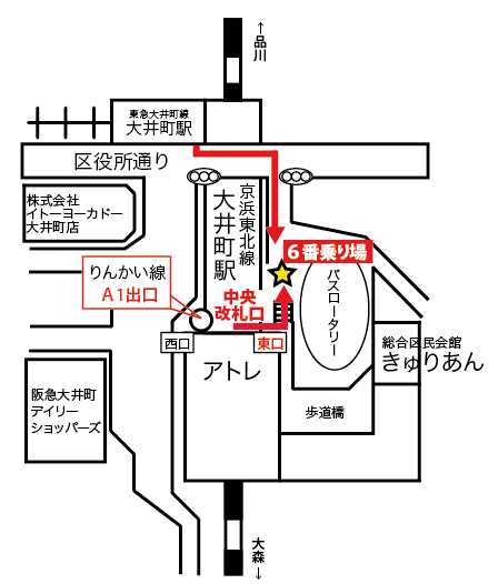 JR大井町駅からご利用のお客様は、必ず中央改札口(アトレ口)をでていただき、東口バスロータリー6番乗り場からご乗車ください。
