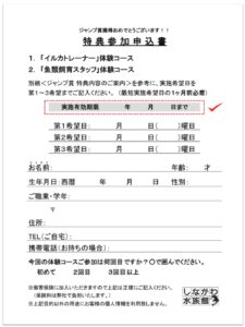 2023年9月30日までに「イルカトレーナー体験」「魚類飼育スタッフ体験コース」に交換お済みのお客様には、賞品の交換日に応じて、実施有効期限を設定させていただいております。