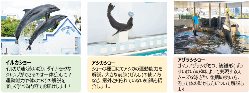 イベント期間中は、「スポーツ」「食欲」「読書」「紅葉」「成長」の5つの「○○の秋」を、しながわ水族館ならではの視点で展開。イルカのジャンプ力やアシカのバランス感覚など、海獣たちの驚きの運動能力を解説付きでお見せするショーや、秋を連想させる生き物の展示、館内の一部エリアは紅葉で彩られるなど、しながわ水族館が秋のムードに包まれます。