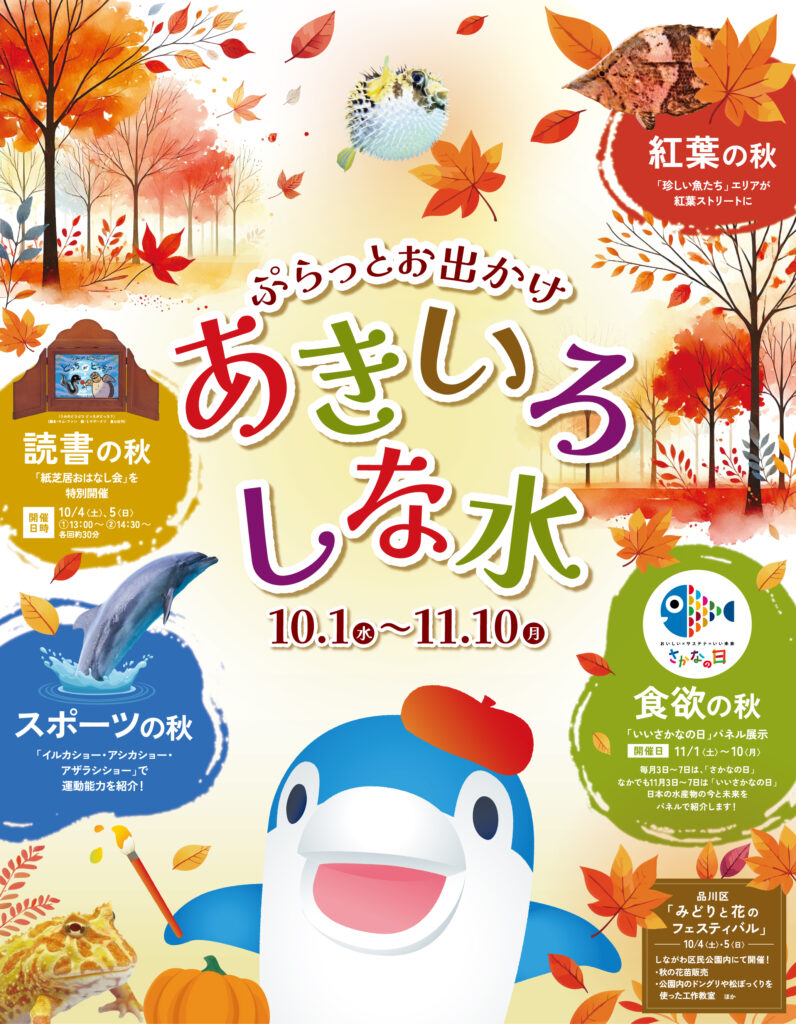 しながわ水族館では、館内各所で5つの「○○の秋」をお楽しみいただける秋のイベント「ぷらっとお出かけ あきいろしな水」を2025年10月1日(水)~2025年11月10日(月)の期間で開催します。