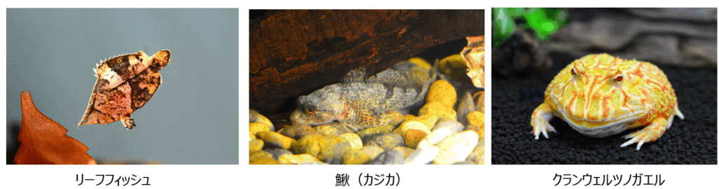 水族館入口すぐの「東京湾に注ぐ川」エリアにあるミズナラ擬木やB1F「珍しい魚たち」エリアに、紅葉の装飾が施されるなど、館内の一部が秋のムードに。また、秋が旬といわれ、魚へんに秋と書く「鰍(カジカ)」や、擬態した姿がまるで落ち葉のような「リーフフィッシュ」、カボチャのような見た目の「クランウェルツノガエル」など、秋を連想させる生き物を展示します。