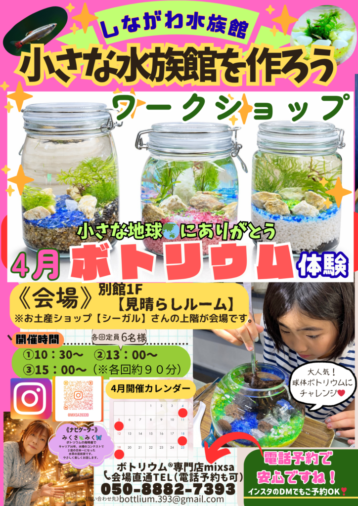 家元てっちゃん先生による、作って楽しい眺めてきれいな超ミニ水族館“ボトリウム”を作れるワークショップを開催します。